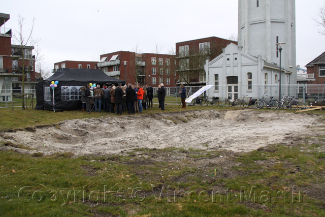 Met het timmeren van een bouwraam, naast de watertoren, door de 8 nieuwe bewoners, werd de start van de bouw ingeluid van 8 appartementen voor Stichting Woonproject Heemstede, aan de Nijverheidsweg. |