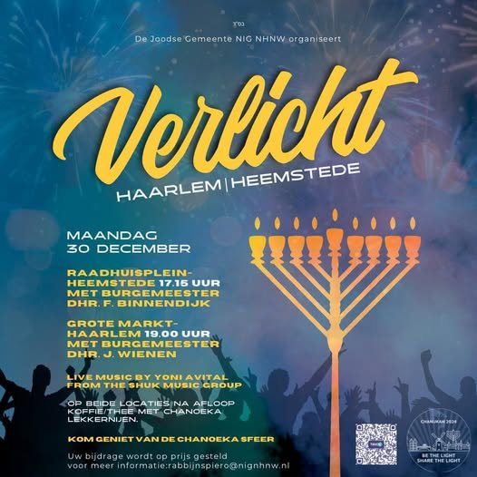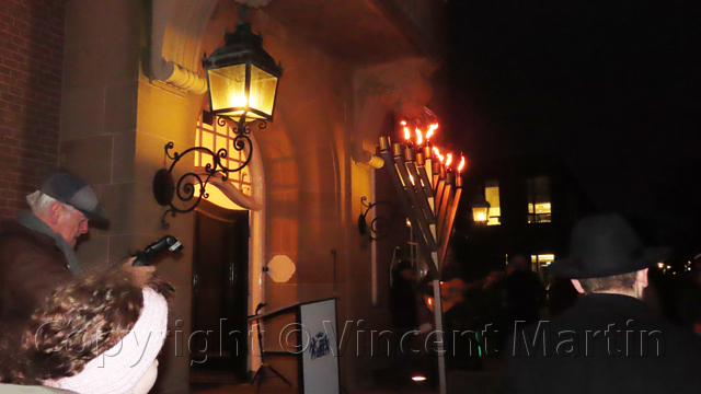Chanoeka viering voor het Raadhuis. Chanoeka betekent "inwijding", het staat ook bekend als "het feest van de lichtjes", "het inwijdingsfeest"of "het toewijdingsfeest"en duurt 8 dagen, de eerste dag van het feest begint na zonsondergang op de 25e dag van de Joodse maand Kislev, |